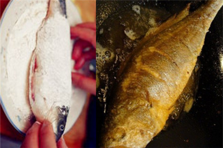 第三步:鱼下锅之前可以拍少许的面粉在两边,这样能够把鱼身上没有擦干的水吸完还能在煎炸的时候更快结焦,鱼在快速结焦后就没有那么容易粘锅了,不过在拍面粉时要掌握好量,拍多了煎出来的鱼就没那么细腻。