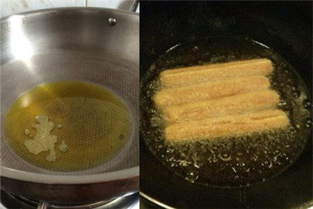 第二步:找出一个方便炸火腿肠的锅洗干净,开始给锅预热,预热完成后就往锅中倒菜油,等到菜油烧熟后就把准备好的火腿肠放进去炸,我们会发现锅中的油在不断的冒小泡泡,这是很正常的。