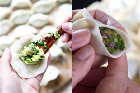 第二步:下面我们拿出买来的饺子皮开始包饺子,把准备好的猪肉韭菜馅用勺子舀一勺或者用筷子挑一点放到饺子皮里面,接着我们把饺子皮对折,然后用手使劲捏边缘,全部捏紧一个饺子就做好了,像这样不停地重复包饺子,把饺子皮或者馅包完就可以了。