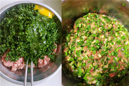 第一步:我们把买来的韭菜和猪肉洗干净,然后分别把它们切碎,韭菜切成一小段一小段的,猪肉就要剁成肉末了,在剁肉末时要重复操作,手臂会有一点酸痛,嫌麻烦的可以直接在菜市场买现成的肉末;然后把韭菜和肉末装进一个大碗里搅拌,同时再打一个鸡蛋进去一起搅拌,加了鸡蛋后馅吃起来会更加细腻,搅拌均匀后就开始包饺子。