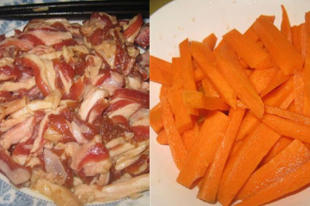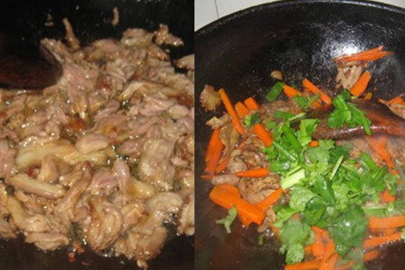 食材:羊肉350克、胡萝卜150克、葱蒜、香菜、白芝麻、孜然粉、盐、油。