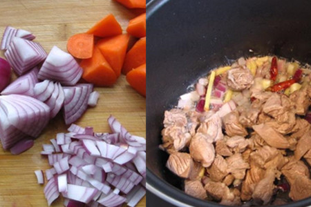 胡萝卜洗净切滚刀块,洋葱一半切大块,另一半切小丁待用。炒锅洗净上灶,放适量油,油烧热之后,将蒜片、洋葱丁、姜片和干辣椒下锅煸炒。炒出香味后,将焯过水的羊肉下锅翻炒,翻炒过程烹入适量料酒,加入2个八角、适量花椒、桂皮、茴香和香叶。炒香之后,加入1勺酱油和一罐啤酒,再兑入适量清水,大火煮开。