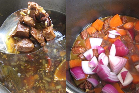 煮开之后,将羊肉和汤汁转至压力锅,加盖,压10分钟。压力锅消气之后,捞出煮好的羊肉放入汤锅中,将汤汁过滤干净也倒入汤锅。汤锅上灶,将胡萝卜块加入汤锅,大火煮开后继续煮20分钟,再调入适量盐。待胡萝卜和羊肉都煮软烂,放入切好的洋葱块,继续煮至洋葱熟透即可。