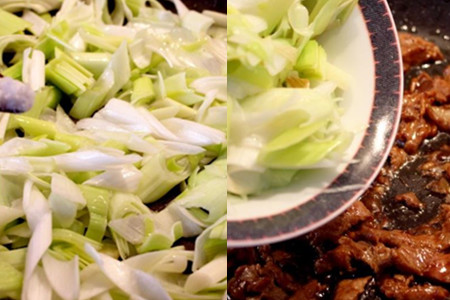 炒锅洗净上灶,放入适量油,油温热之后,将切好的葱段下锅,快速煸炒。葱段煸出香味后,调入适量食盐炒匀后盛出锅待用。炒锅重新放油,油热之后,将腌入味的羊肉下锅,快速炒开。羊肉变色后,立刻将炒过的葱段回锅,炒匀即可起锅。