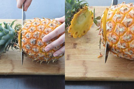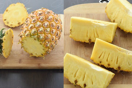 1、朋友们拿到菠萝之后,将其摆放在菜板上,然后用菜刀将菠萝的头部与底部的皮都直接横向切掉。然后再将菠萝从中间纵向一分为二。在切的过程中,朋友们一定要将菠萝固定在案板上,千万别切伤手指。剥落分泌出的液体会让人皮肤刺痒,朋友们尽量带着手套来操作。