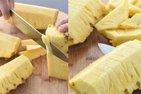 2、然后选择其中的一块,将果肉中间的梗纵向切掉,然后再横向将菠萝切成三厘米左右的小块。在切的时候一定要注意,菜刀不要将底部的皮切掉。剩下的菠萝块也按照这样的方式来处理。在这个过程中,朋友们还可以将大的菠萝块纵向再切几刀,这样菠萝块的大小就更加合适了。