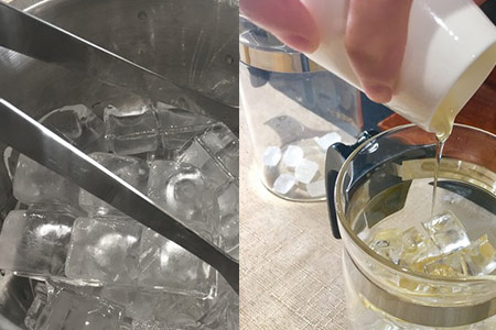 2、将切好的柠檬片洗干净后放在一个杯子之中,然后加入比较多的冰块,并加入少量的蜂蜜。然后将红茶用九十五摄氏度的热水泡开,并倒入到另外一个瓶子之中,并在瓶子中加入适量的冰块。朋友们需要让其中的冰块快速地融化,因此需要时不时地摇晃几次。