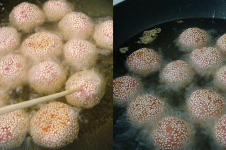 烧锅洗净上灶,放入适量油,大火烧热,将糯米球放入热油炸制。炸制期间,用竹签在每个糯米球上扎几个孔,让糯米球中的气体排出。待糯米球浮在油面上,就说明基本炸熟了,这时候再开大火炸一会,就可以捞出锅控油了。