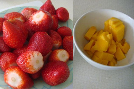 买回来的草莓放入盐水浸泡30分钟,清洗干净待用。芒果去掉外皮和果核,切成小丁,装入碗中,加入适量蜂蜜,拌匀待用。
