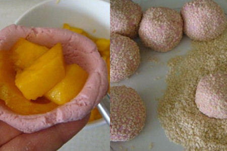 将糯米团挤出多个小团,揉成圆片,取适量芒果丁做馅料包起来。包全部包好之后,将糯米球放在芝麻上滚一滚,使得表面均匀地裹上芝麻。