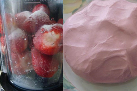 将洗净的草莓倒入搅拌机,加入少许白糖,加盖,打成草莓汁。糯米粉装入盆中,兑入打好的草莓汁,混合均匀,揉成粉团。