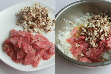 食材:糯米100克、粳米50克、胡萝卜10克、豌豆15克、香菇100克、玉米粒30克、腊肠100克。