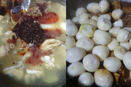 料酒炒出香味之后,兑入适量清水,加入麻辣香锅料,拌匀,大火煮开后转为中小火,加盖慢炖。鸡块炖至8成熟时,开盖,放入去皮的芋头,加盖,继续炖煮。