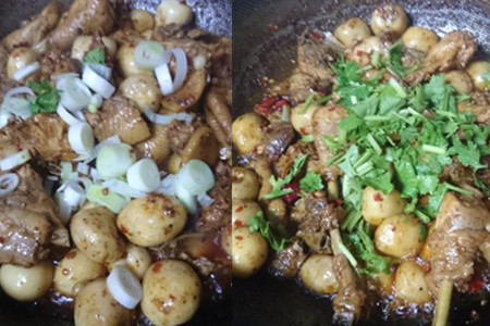 芋头炖熟之后,放入葱片和干辣椒段,炒匀。出锅前撒入香菜碎即可。