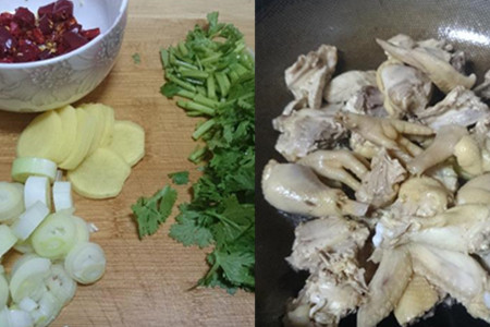 干辣椒洗净切小段,葱姜洗净切片,香菜洗净切碎。炒锅洗净上灶,下适量油烧热,油热之后,将焯过水的鸡块放入炒锅,调入适量料酒,炒匀。