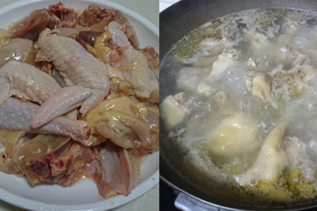 鸡处理干净,斩成大小合的块状。煮锅洗净上灶,加入适量凉水,将鸡块下锅,大火煮开,把鸡块的血水焯掉。鸡块焯好之后,捞出锅,用清水冲洗掉表面上的杂质和血沫。