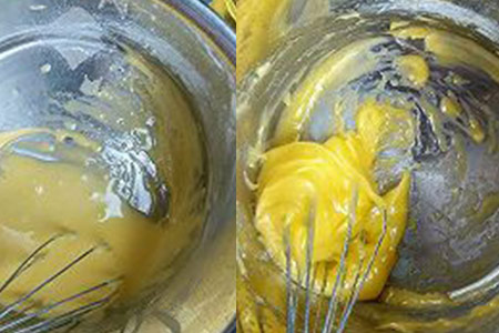 2、加入食用油之后,原来已经浓稠的蛋黄又变稀了,朋友们不用担心只要继续沿着一个方向进行搅拌。朋友们搅拌的速度需要不断地加快,这样食用油与蛋黄才能融合的比较均匀。在这个过程中,朋友们家重复加入一些油,直到六十克食用油都用完。这时候容器内的颜色就更浅了。