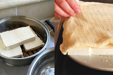 1、朋友们需要从市场买回来一块新鲜的豆腐,尽量买稍微有点硬的,这样制作的过程中豆腐不会碎掉。朋友们可以将豆腐切成三厘米厚度的大块,然后放在锅中隔水蒸十三分钟左右。将蒸好的豆腐放在案板上,并盖上纱布,并将豆腐块上的水分都擦干。然后在纱布的上面压上比较重的东西,至少要压四个小时。