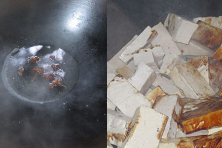 3、往锅中加入一些盐与糖,喜欢辣椒的朋友,还可以加入一些切碎的辣椒。之后朋友们就需要用铲子进行不断地翻炒,直到豆腐块上的颜色都均匀了。之后,朋友们将之前的八角与热水都倒入在豆腐块上,并盖上锅盖焖两分钟左右。等闻到香喷喷的味道,就说明豆腐干做好了。
