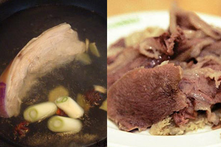 3、再烧开一锅水,将已经焯过水的猪肉、姜片、大料等放进去。等水开之后,朋友们将火调小一些,并盖上锅盖。一般要连续小火煮四十分钟,然后朋友们将筷子插入肉中,这样轻轻地就能将猪肉插透,就表明猪肉已经煮好了。将肉捞出之后切成小块,就可以蘸着酱汁食用。