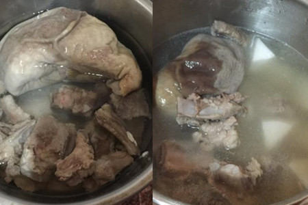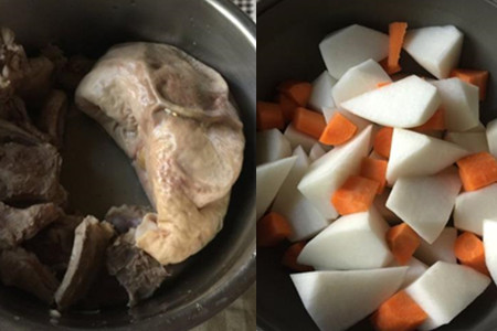 将焯过水的排骨和猪肚放入炖锅,对入清水盖过食材,加盖,大火炖煮。待排骨和猪肚都熟透之后,将切好的萝卜块加入锅中,开盖,大火煮沸后转为小火炖煮。