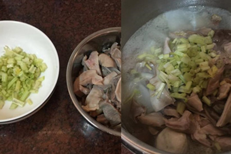 芹菜洗净切成碎,把切好的猪肚条和芹菜碎放入汤中即可。