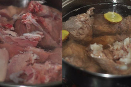 猪龙骨清洗干净,煮锅洗净上灶,加入适量冷水,将猪龙骨下锅,大火煮沸后捞出。煮锅重新换上清水,将焯过水的骨头下锅,加入少许生姜和、花椒和大料,大火煮沸。煮沸之后,烹入适量酱油、料酒,捞出水面上的浮沫,转为小火炖1个小时。