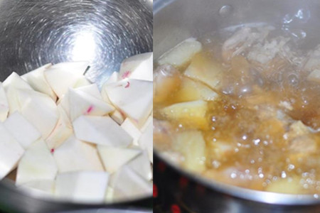 大萝卜削皮切块待用。骨头炖至1个小时后,将萝卜块放入汤中,加盖,小火炖至萝卜软烂即可。