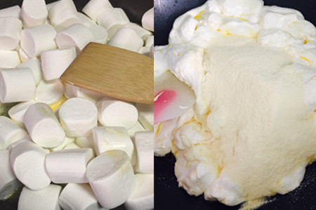 我们自己在家也是可以做出美味牛轧糖的,千万不要以为这种糖果做起来很复杂,其实只要准备好原料就可以了。在家做,工具和原料虽然比不上厂家的制作水平,不过我们都是可以想办法解决的。准备好棉花糖、蛋清、花生碎以及适量的奶粉,棉花糖既可以代替糖浆,又可以赋予牛轧糖靓丽的颜色,放在碗里,用微波炉加热至糖果全部融化就可以了。