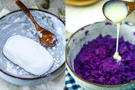 2、将面团揉至光滑,并放在温暖的地方静置十分钟左右。蒸好的紫薯外皮去掉,然后将紫薯用勺子压成泥状。为了让紫薯的味道更好吃,朋友们还要在紫薯泥之中加入一些炼乳并不停地搅拌。朋友们不要一下子将炼乳倒入其中,而是要一点点地加入,不然紫薯泥会变得比较稀。