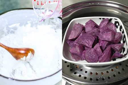 1、朋友们要准备好适量的淀粉或者是西米粉,然后往淀粉中加入热水。为了让汤圆的外皮更为软弹,那么朋友们就要在其中稍微加入一些木薯粉。在加入的过程中也要用勺子搅拌。在做外皮的时候,朋友们要将紫薯切成大小一致的小块,放入锅中之后隔水蒸熟。