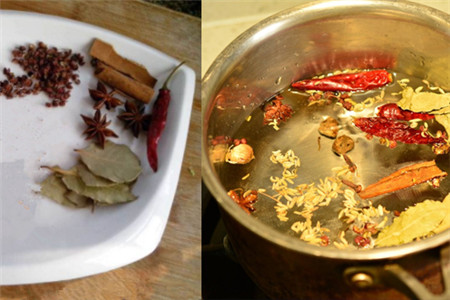 第一步:拿一个汤锅,在里面加入清水,然后放在灶上面开火,先把八角、肉桂、香叶这些卤料加进去,等到锅里的水烧沸腾之后,再放入少许的卤料粉、花椒、干辣椒、生姜关小火熬制,注意放入的生姜要用刀拍碎,这样才能把生姜的味道更好的煮出来。