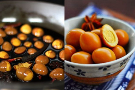 第二步:等把卤料的香味熬出来后,锅里的汤颜色会变深,从原来透明的颜色变成之后的深棕色,这时候汤汁熬制的差不多了,在里面倒进之前煮好的鹌鹑蛋,开大火把水二次煮沸后关小火继续熬制,在里面加入适量的食用盐,用细火煮十分钟左右,鹌鹑蛋就会入味;这时找一个空碗和漏勺,用漏勺把鹌鹑蛋全部捞出把卤汁沥干后装进碗中,卤鹌鹑蛋就完成了。