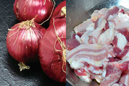 首先第一步,我们需要准备一个洋葱,还有1块五花肉,如果不喜欢吃五花肉或者是害怕五花肉热量会太高的朋友,也可以把五花肉换成牛肉,或者是其他自己喜欢的肉。