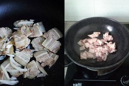 第二步,把洋葱洗干净,然后切成小丁,五花肉同样洗净,然后切成正方形的肉块,肉块应该要切大一点,因为这样炖出来的猪肉会更加地滑嫩爽口。