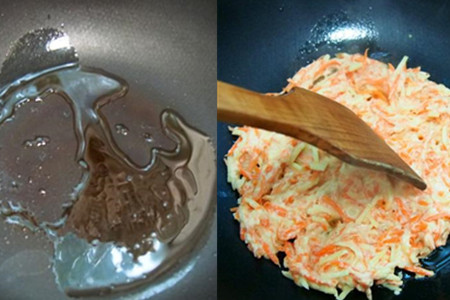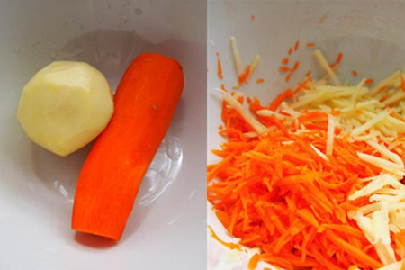 食材:胡萝卜1根、土豆1个、面粉2勺、虾皮1勺、蚝油1汤匙、盐、油。