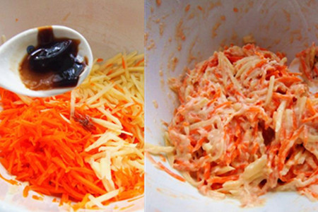 把去皮的胡萝卜和土豆擦成丝,调入勺蚝油和少许食盐,拌匀,再加入适量面粉和汤匙虾皮,兑入适量清水,拌匀,搅成糊状即可。