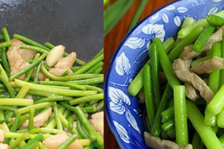 第三个步骤:还要加入油在锅中,用来炒蒜苗的,油烧热之后,将蒜苗倒入进去炒。需要炒8分钟左右,然后就将之前炒好的猪肉一起倒入进去炒。