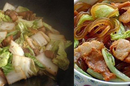 第四步:继续在锅里面倒入一些油,将白菜梗先放进去炒5分钟,然后就将猪肉片一起粉条放进去一起炒,大概一起翻炒3分钟,倒入水开始炖煮。炖煮的时候可以放少许的盐进去,提前让菜入味。