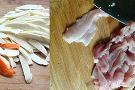 步骤1:选择新鲜的茭白,将它外面的表皮去除干净,然后用菜刀切成薄片状。猪肉切的形状和茭白差不多就行了。很多人都想要让炒出来的猪肉口感更加嫩滑一点,这样有什么诀窍吗?大家可以用淀粉加水将猪肉腌制一下,这样炒出来的猪肉就不会很难咬了。