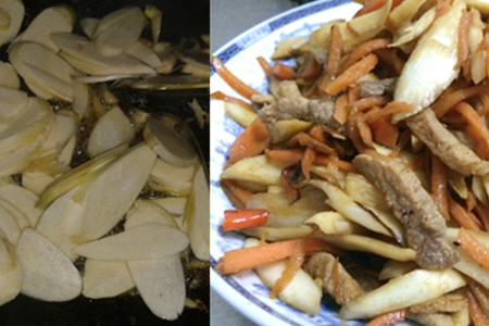 步骤3:油温达到合适的温度时,就把茭白倒入锅中翻炒,使用大火炒蔬菜味道会更加的好,并且熟的也比较快,翻炒5分钟后就可以将猪肉片倒入进去一起翻炒。喜欢吃辣椒的人可以切一些新鲜的辣椒放进去炒。