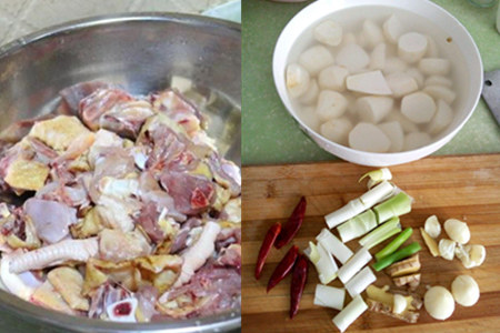 第二, 鸡肉洗净后,剁成小块;芋仔削皮,切成滚刀块。