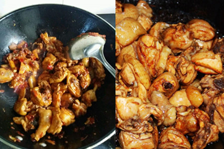 第三, 起锅,下适量的油,撒下一小把冰糖,小火煮至融化,然后放入鸡肉、八角、花椒、桂皮翻炒均匀,调入豆瓣酱继续炒上7-8min。