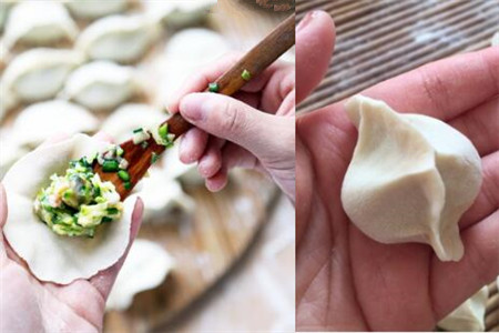 第四步,我们就可以开始包饺子了。用左手先拿起一张饺子皮,用右手拿着勺子挖一坨馅料放到面皮中间,然后左手大拇指和食指和右手大拇指和食指一起用力捏,使它形成一个饺子的形状就可以了。