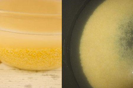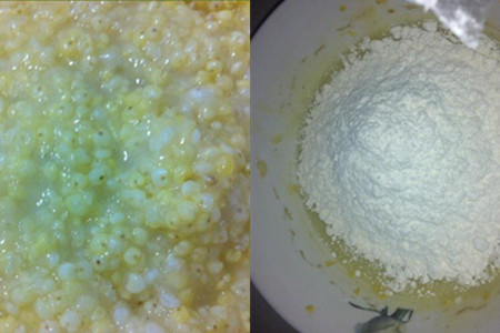 煮成粥之后,将小米粥倒入粉碎机中打成浆液。倒出小米浆,加入准备好的低筋面粉、糯米粉、奶粉和酵母,拌匀。