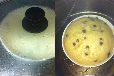 待小米鸡蛋液发酵变大后,将其冷水下蒸锅,加盖,开中火蒸30分钟即可关火。