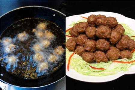 第四步:把盘子中的丸子放到油锅中炸,然后起锅装盘,一道油炸蘑菇丸子就完成了。