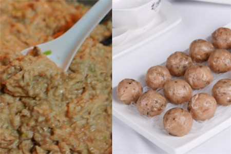 第三步:把调制好的蘑菇丸子肉末搓成丸子的形状,首先我们要先拿出一个盘子,然后开始用勺子舀一勺放在手心中,把它揉成一坨放在盘子上,就这样重复做,把揉好的丸子整齐的摆好;在揉的时候可以在手上撒一点水,这样肉末才不会粘到手上。