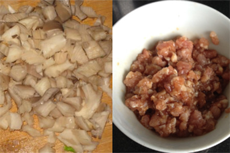 在做香菇炸丸子之前,先要准备好这些东西:蘑菇适量、瘦肉、鸡蛋。第一步:把蘑菇和瘦肉洗干净水沥干,蘑菇用刀切成一小粒小粒的,瘦肉需要剁成肉末,嫌麻烦的人可以直接买肉末回家,但是买的现成肉末没有自己在家剁的新鲜。
