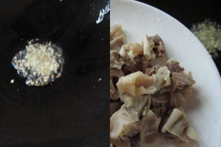 2.炒锅洗净上灶,放油好热,将蒜粒下锅爆香,将切好的隔山肉下锅煸炒。